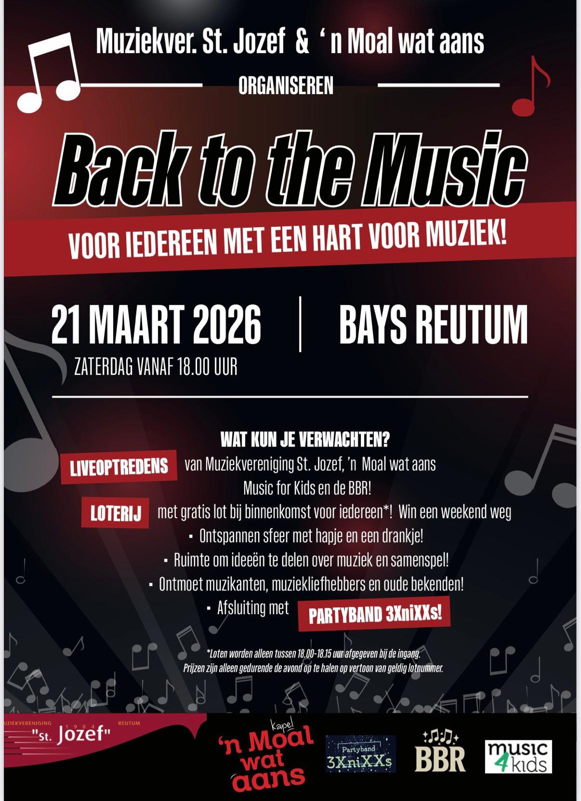 Op zaterdag 21 maart organiseert Muziekvereniging St. Jozef, 'n Moal wat aans, Music for kids en BBR samen een "Back to the music" avond bij Bays.